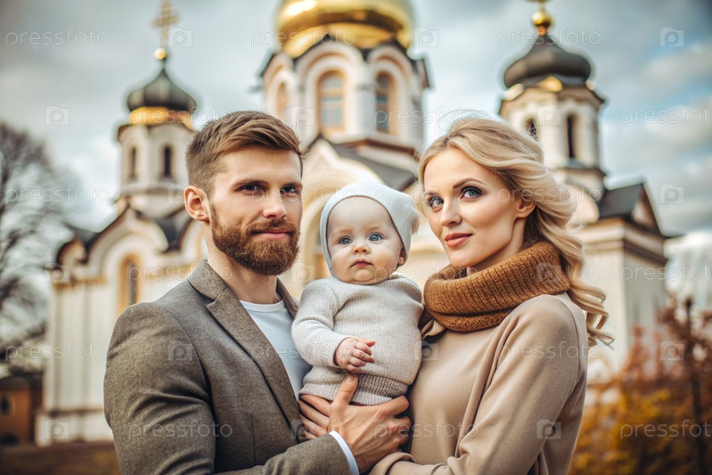 Всероссийский день семьи, любви, верности мужчина и женщина с ромашками с ребенком в руках на фоне православной церкви День святого Валентина Петра и Февронии