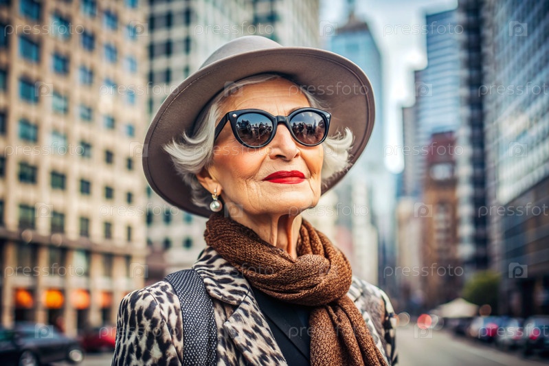 Портрет стильной, модной пожилой женщины, 70-летнего пенсионера на улице с очками и одеждой в спокойных бежевых тонах