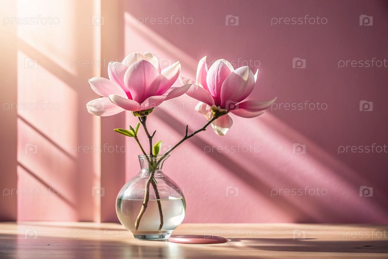 Элегантная магнолия цветет на ветке в стеклянной вазе на розовом фоне с контрастным солнечным светом. Нежные цветки с розовыми оттенками. деревенская ветка