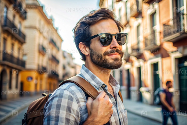 Портрет счастливого красивого хипстера-путешественника с рюкзаком и солнцезащитными очками. Сольное путешествие, образ жизни. Молодой турист наслаждается отдыхом в солнечный день