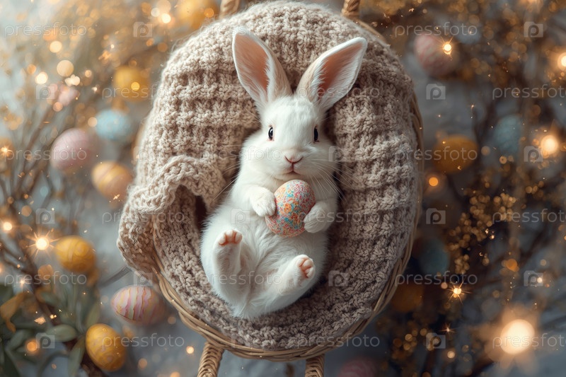 Пасхальный кролик пасхальное яйцо в лапах, лежащее на спине на сером вязанном одеяле в корзине из колючки и уставившееся в камеру