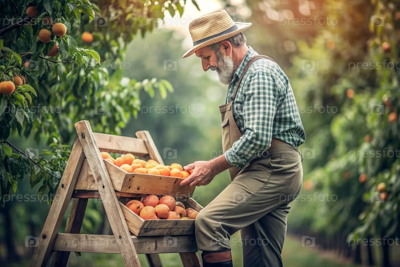 Сельскохозяйственная промышленность. Деревянный ящик с абрикосами в руках фермера-мужчины. Садовник собирает богатый урожай. Ближе, солнечный свет. Осенний урожай фруктов