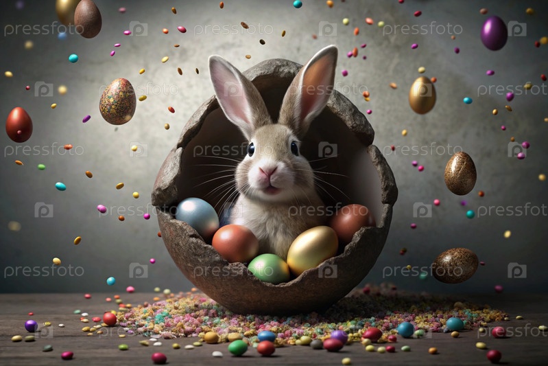 Известный праздник. милый пасхальный кролик заглядывает из ямы с красочными яйцами вокруг. концепция счастливой Пасхи