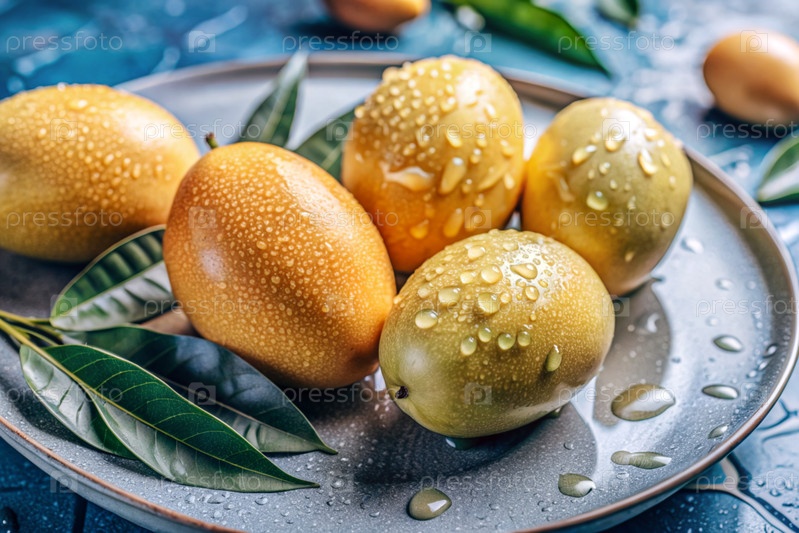 Свежие манго. Вкусные ягоды и фрукты ярко-желтого цвета с капельками воды. Вегетарианство. Здоровое питание. Свежий плод на столе