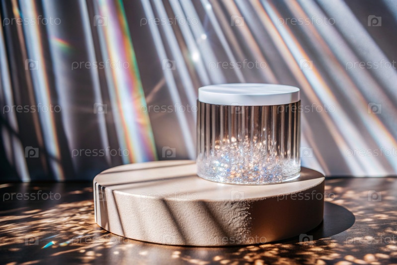Пустой цилиндрический подиум со сверкающими кристаллами при преломлении света на минималистическом фоне, стенд для демонстрации моделей косметики и товаров