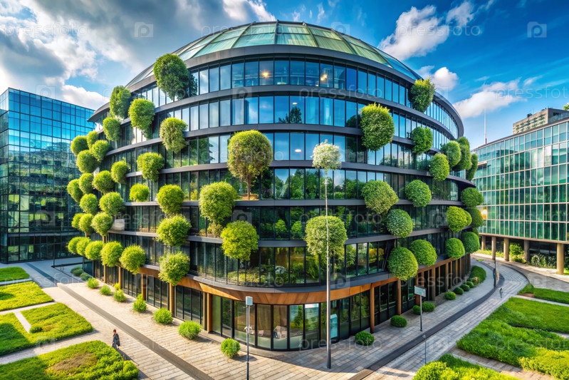 Современная городская экология. Снижение выбросов углекислого газа в городе. Экологически чистое стильное здание с посаженными зелеными растениями для нормализации содержания кислорода в воздухе