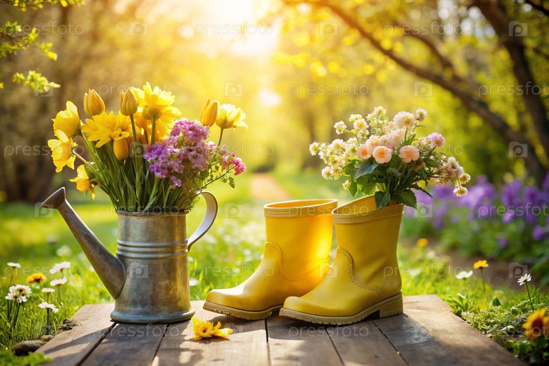 Время весны. натюрморт с желтыми резиновыми сапогами, ретро-железной оросительной банкой и букетом нарциссов. яркий солнечный сад