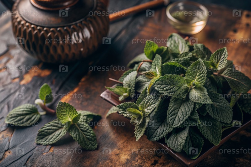 Закрытие зеленых листьев мяты. Листья с заметными венами и текстурой. Мента, бальзам для приготовления чая. Травяной чай для нервной системы