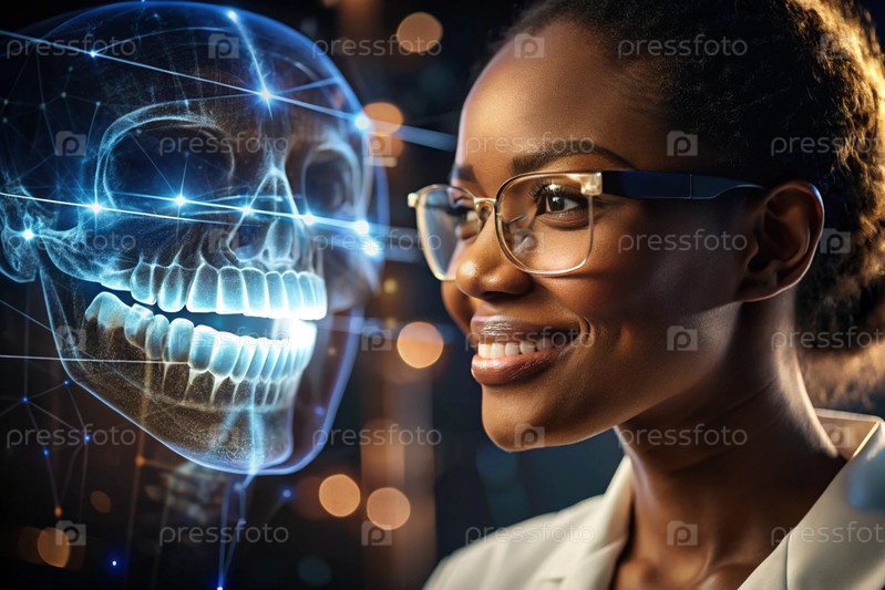 Новые технологии цифрового искусственного интеллекта в зубных протезах. Имплантаты. Чернокожая женщина-стоматолог с идеальной улыбкой и цифровой стоматологической графикой на виртуальном экране. Концепция здоровья зубов и ухода за зубами