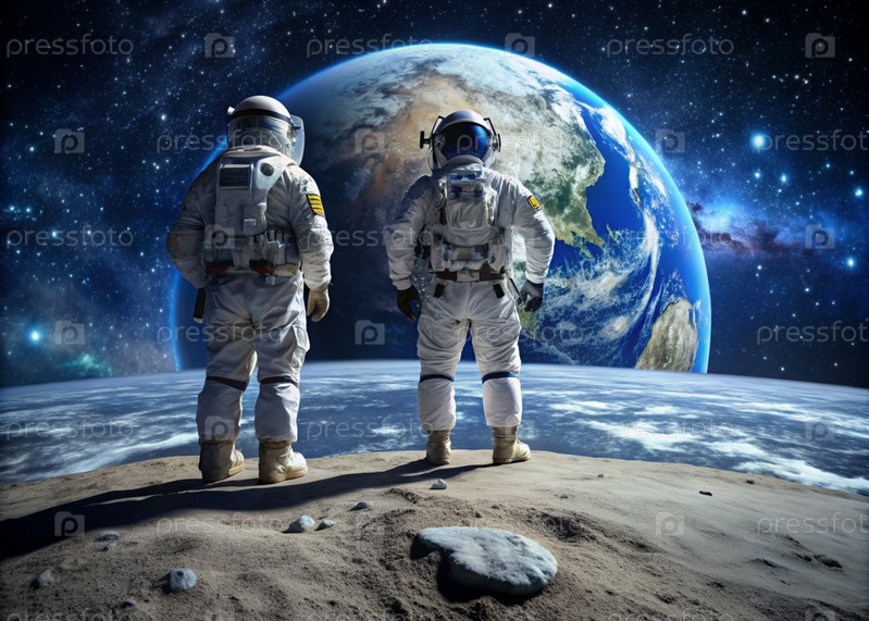 Счастливый День космоса.Астронавты в скафандре на Луне в космическом пространстве.Впечатляющий вид на планету Земля