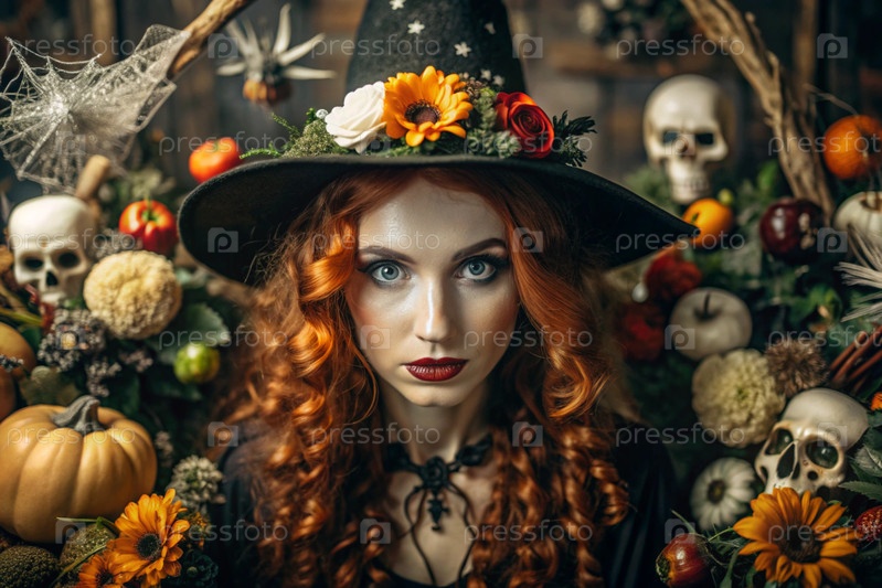 Концепция Хэллоуина. Ужасное. Костюмированная вечеринка. Красивая женщина в костюме ведьмы. Баннер, открытка