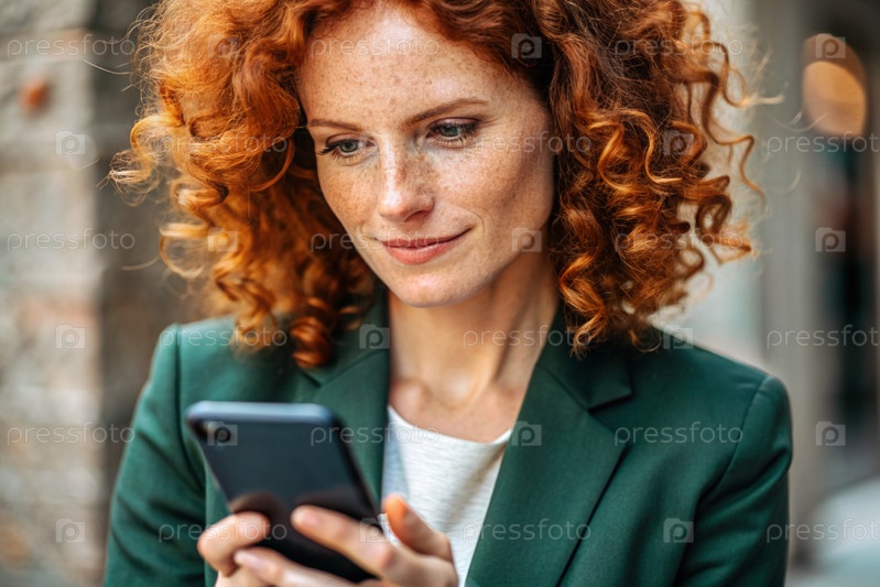 Деловая женщина с локонами красных волос и веснушками. Она одета в обычное зеленое пиджак. В руках смартфон. Небольшой бизнесмен смотрит на свой мобильный телефон