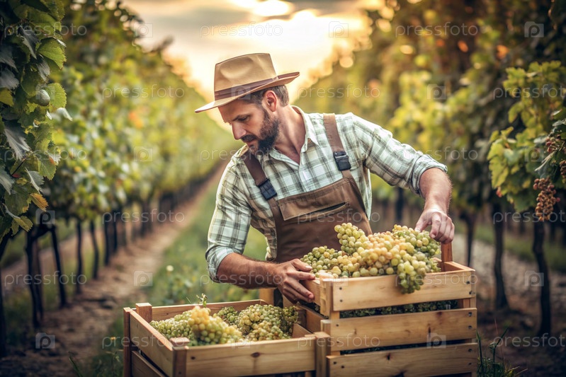 Сельскохозяйственная промышленность. Производство вина. Деревянный ящик с виноградом в руках фермера-мужчины. Садовник собирает богатый урожай. Ближе, солнечный свет. Осенний плодовый сбор