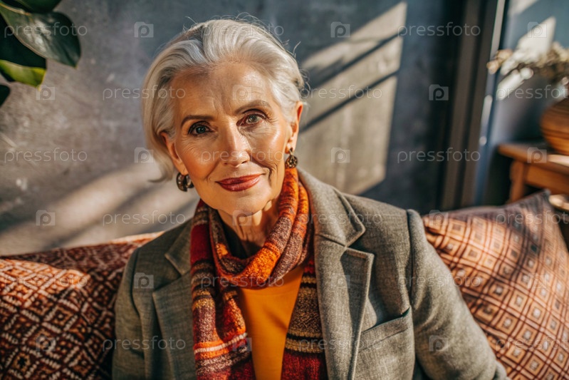 Минимализм.Студийный портрет стильной, элегантной пожилой женщины, 70-летнего пенсионера в интерьере и одежде спокойных тонов.Концепция пожилых людей