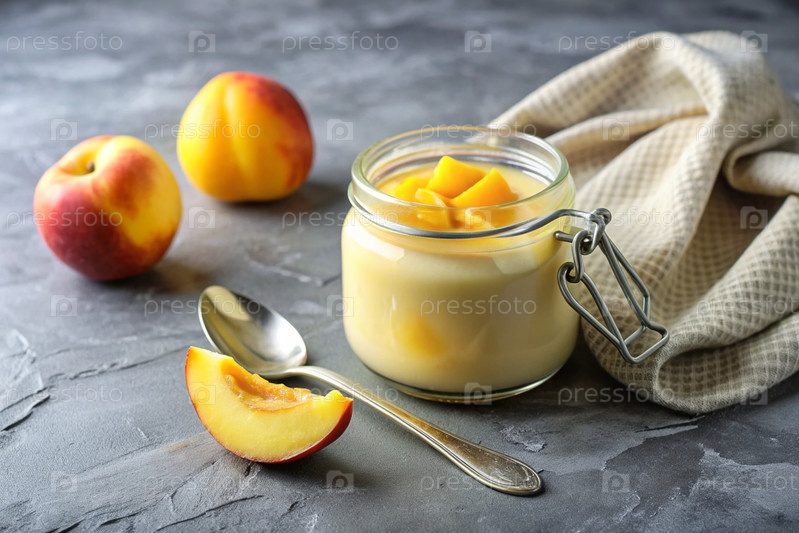 Домашний персиковый йогурт со свежими персиками, винтажной ложкой и полотенцем на стильном сером фоне