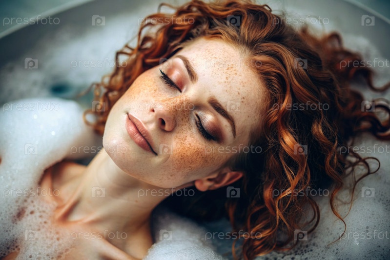 Близкий план красивой рыжеволосой женщины с веснушками и кудрявыми волосами, без макияжа. Она принимает баню из пузырьков. На заднем плане интерьер ванной комнаты в стиле лофт