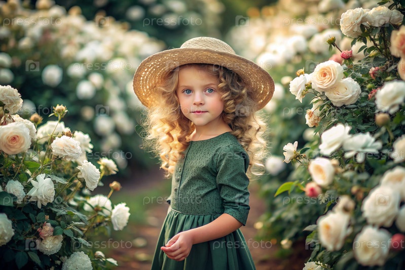 Портрет красивой кудрявой девушки в соломенной шляпе и платье в цветущем розовом саду. Детство. Девочка позирует и смотрит в камеру