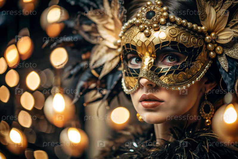 Карнавал Венеции.Закрытие женщины в украшенной карнавальной маске.Яркие цвета передают атмосферу празднования и роскоши