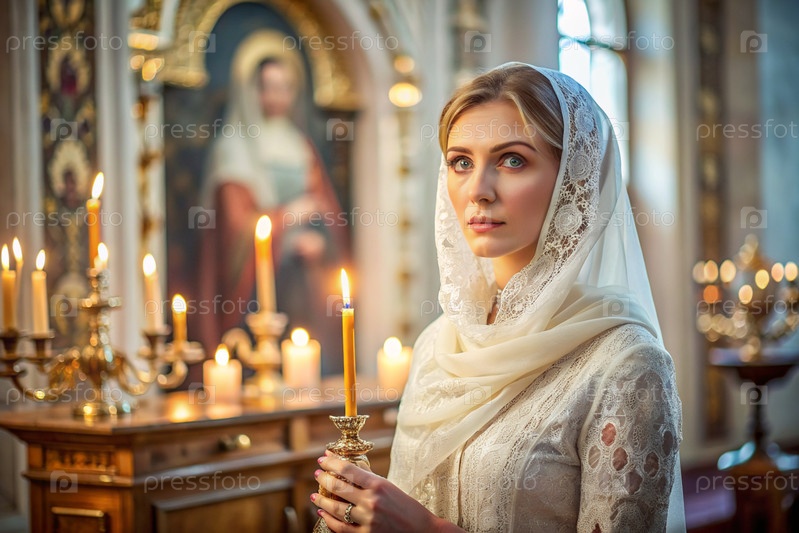 Портрет красивой молодой женщины с платками в православной церкви.Девушка молится в церкви среди икон