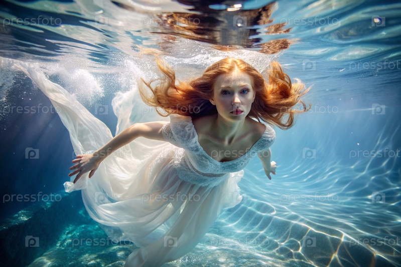 Портрет красивой рыжеволосой девушки в модном белом платье под водой на глубине