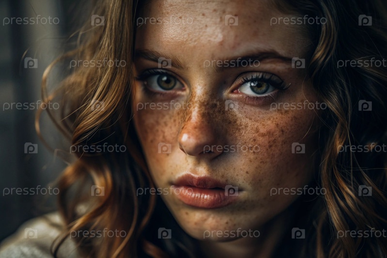 Глубокий эмоциональный портрет. Лицо молодой девушки без макияжа с выразительными глазами и кудрявыми коричневыми волосами. Естественная женская красота
