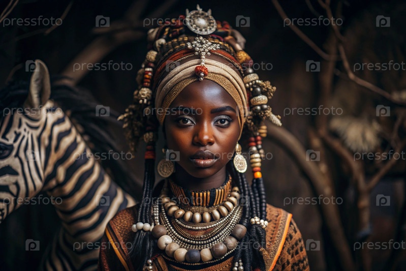 Красивая африканская девушка в традиционном национальном костюме против зебры портрет символизирует традиции и красоту африканского народа