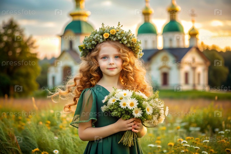 Всероссийский День семьи, любви и верности Красивая маленькая кудрявая девочка с букетом ромашек на фоне Православной церкви День святого Валентина Петра и Февронии