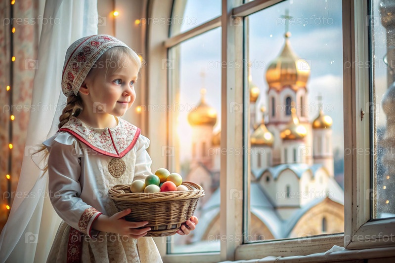 Счастливая Пасха. Христианство. Портрет трехлетней девочки в русском народном платье и шалах с корзиной из плети с пасхальными яйцами в руках на фоне православной церкви