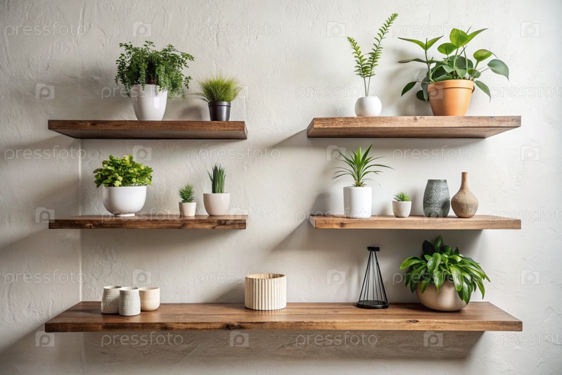 Детали дизайна интерьера. На яркой стене расположены деревянные полки с горшковыми растениями. Скандинавский стиль