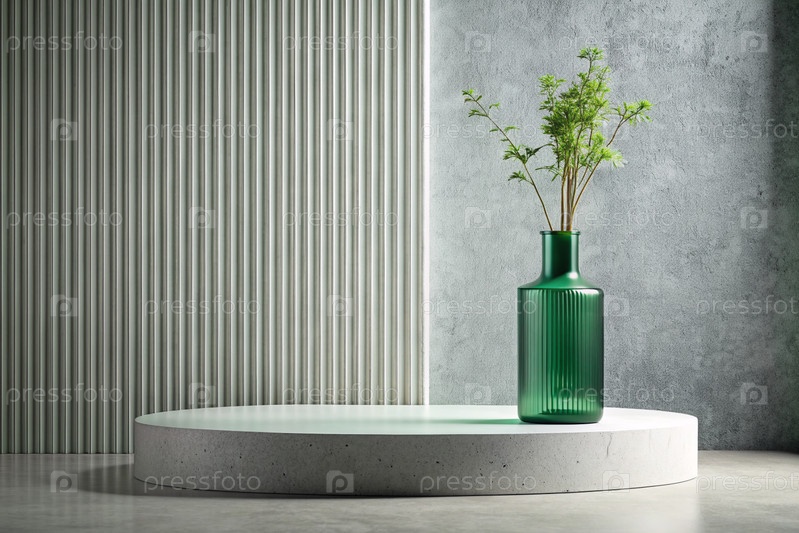 Минимальный фон для демонстрации продукта. Современная сцена подиума с текстурированной бетонной стеной и стеклянной вазой. Элегантный дизайн для презентации продукта