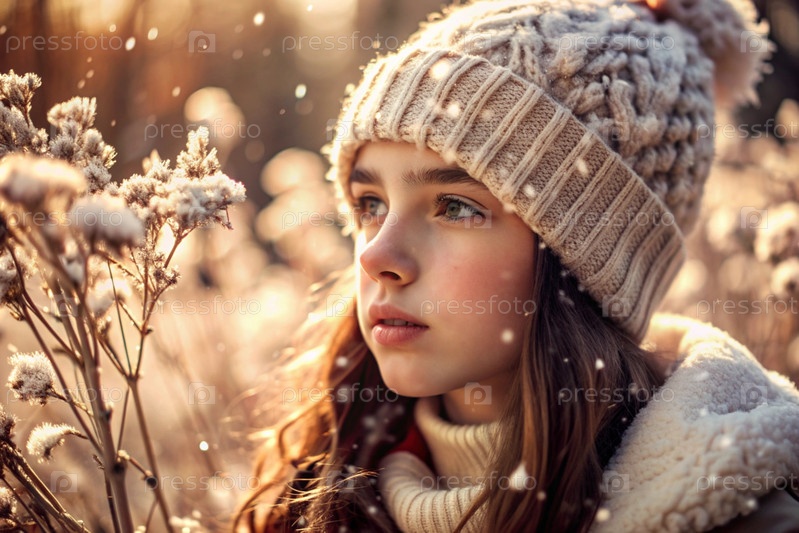Зимний портрет. Близкий план молодой девушки в вязанной шляпе, шарфе и наружной куртке