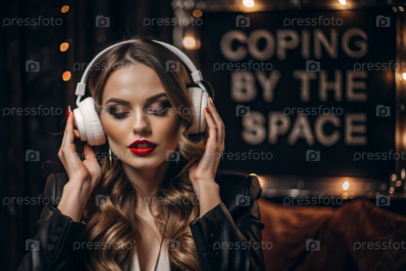 Молодая красивая гламурная девушка с большими наушниками и ярко-красной помадой, слушающая музыку на ушах