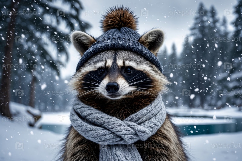 Портрет вязаной зимней шляпы и шарфа, животное в снегопаде зимой