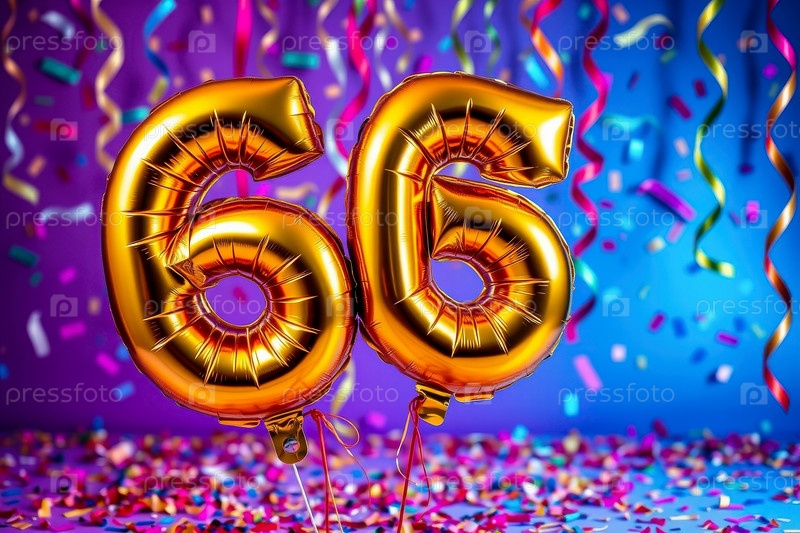 Гелийный баллон номер шестьдесят шестой, фигура золотых букв 66 праздничный фон