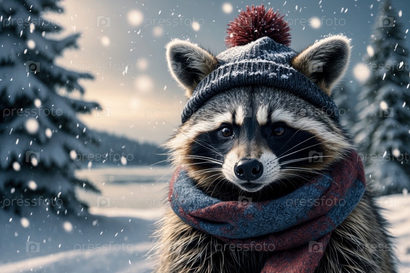 Портрет вязаной зимней шляпы и шарфа, животное в снегопаде зимой