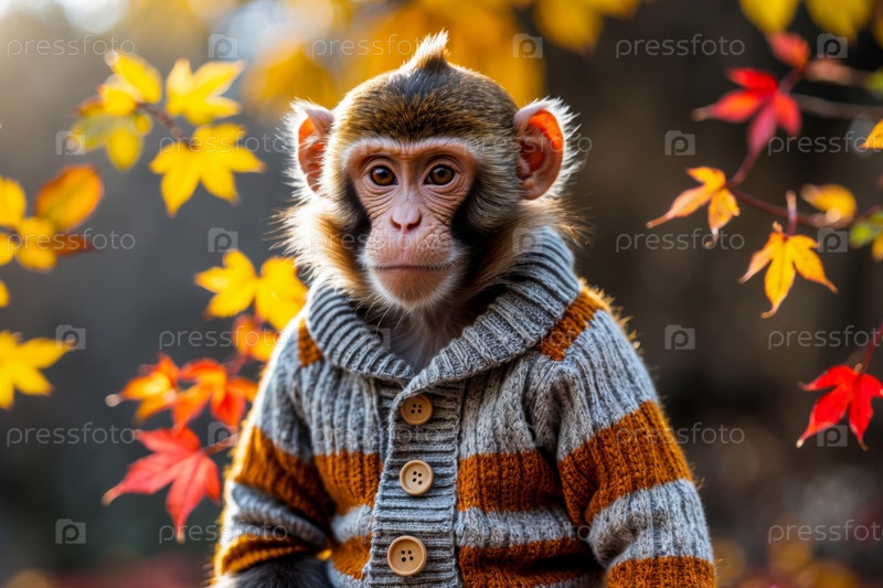 Обезьяна в трикотажном свитере осенний лесный фон, животное в красно-желтой листьях AI Generative