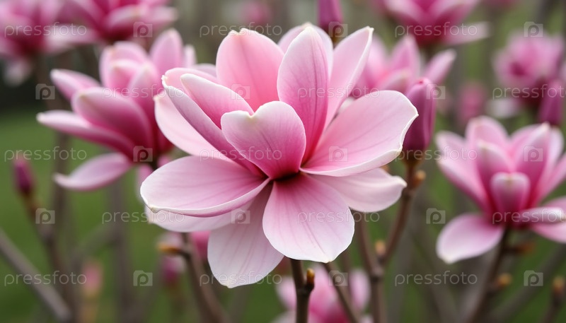 Деликатные цветы магнолии излучают красоту в саду, их мягкие розовые лепестки раскрываются под теплым весенним солнцем, окружены зеленью, которая усиливает их очарование