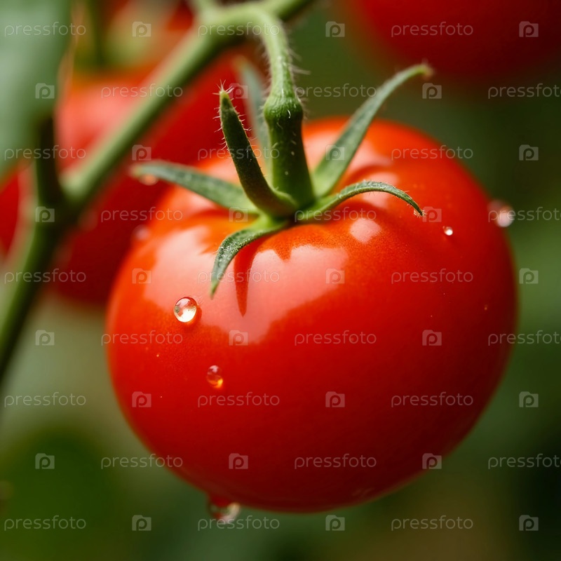 Ярко-красный помидор висит на виноградной лозе, украшенной свежими капельками дождя, в окружении зеленых листьев под теплым солнечным светом безмятежного Generative AI сада
