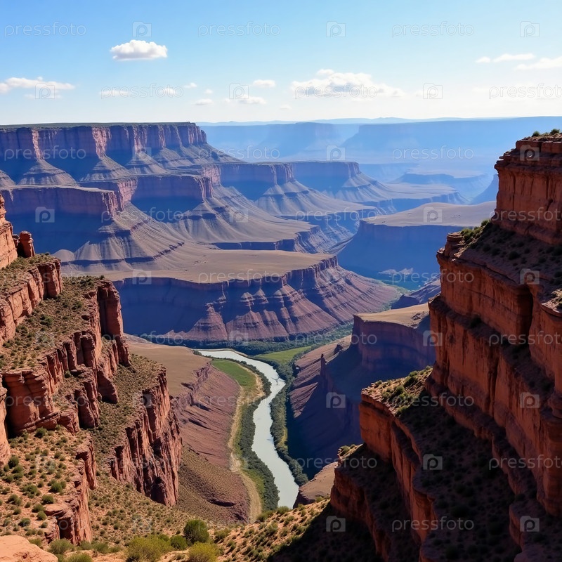 Удивительная панорама открывает потрясающие слои и текстуры Гранд-Каньона.Витязная река медленно течет среди огромного солнечного пейзажа с высокими скалами и плато