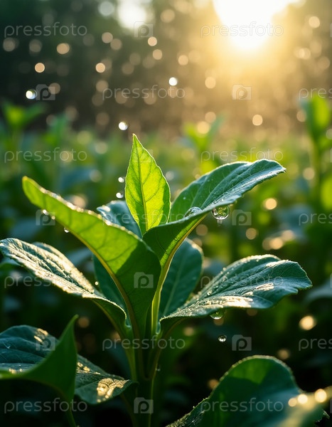 Свежий утренний свет купается в пышных зеленых листьях на поле. капли дождя цепляются за листвы, отражая теплое сияние солнца и улучшая мирную атмосферу раннего рассвета