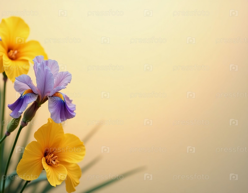 Деликатный фиолетовый радужник и ярко-желтые цветы создают потрясающий дисплей на теплом пастельном фоне.Красота природы сияет в этой спокойной садовой обстановке, приглашая к восхищению генеративного ИИ