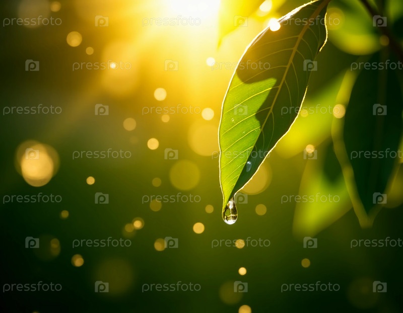 Солнечный свет фильтрует пышную листву, освещая капли воды, нежно висящие с зеленых листьев