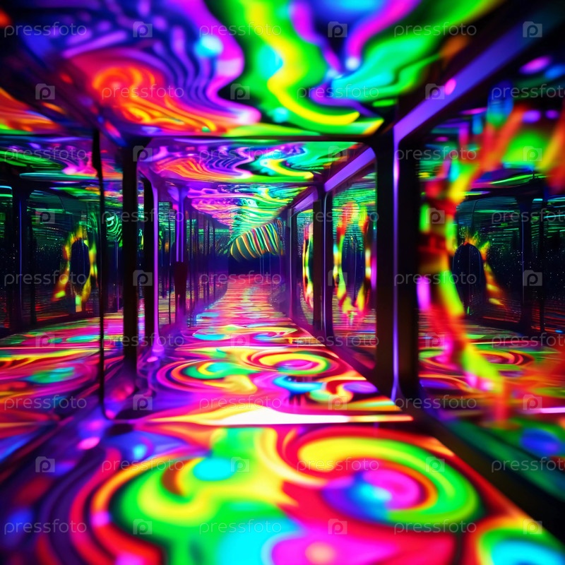 Вихревые узоры ярких цветов освещают зеркальную комнату, создавая завораживающую атмосферу, идеальную для отдыха и исследования