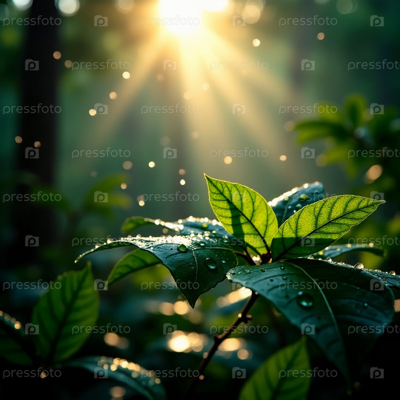Роса светит на ярко-зеленых листьях, а утренний солнечный свет проникает сквозь деревья