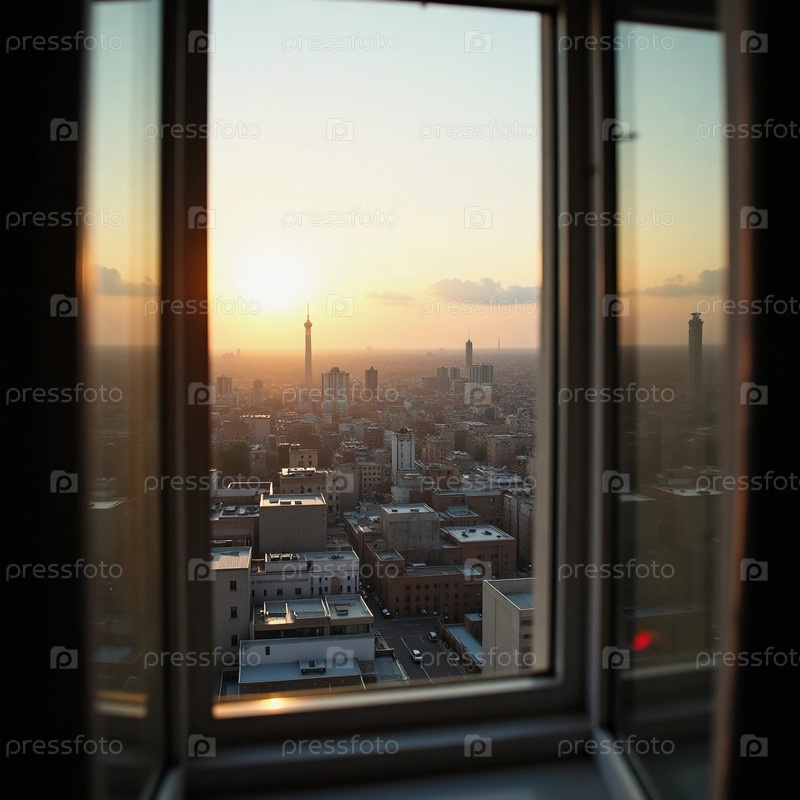 Таящие оттенки оранжевого и золотого каскада над городом, как солнце погружается ниже горизонта, бросает теплый свет на горизонт смотреть через высокие окна