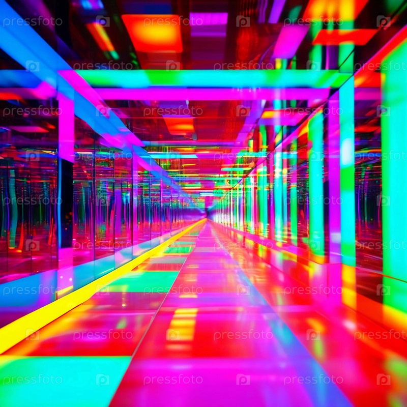 Красочные огни освещают длинный отражающий коридор, наполненный яркими неоновыми узорами