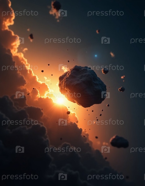 В глубоком космосе золотой свет проникает сквозь темные облака, обнаруживая плавно дрейфующие астероиды