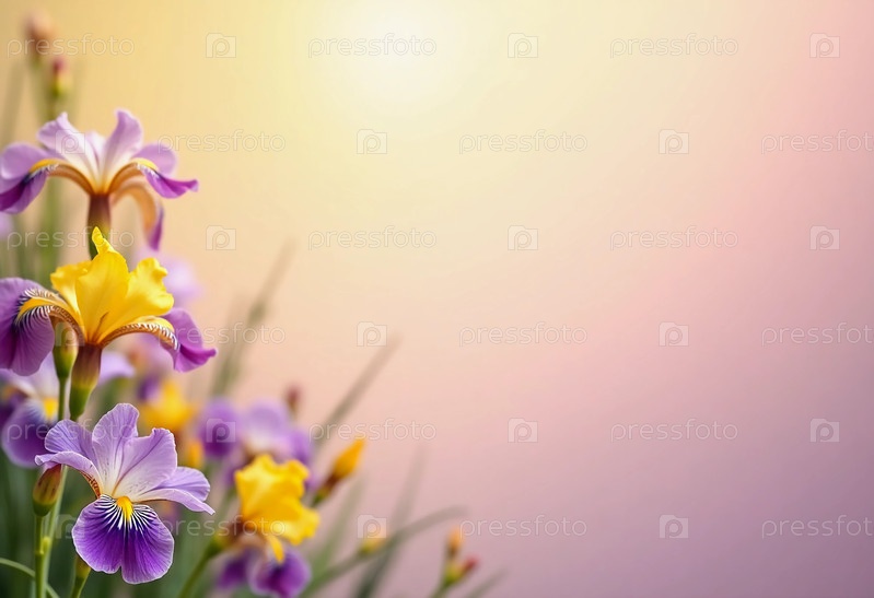Яркие ирисы в оттенках фиолетового и желтого мягко раскачиваются в тихом саду, греясь под теплым пастельным солнечным светом, который фильтрует цветение цветов