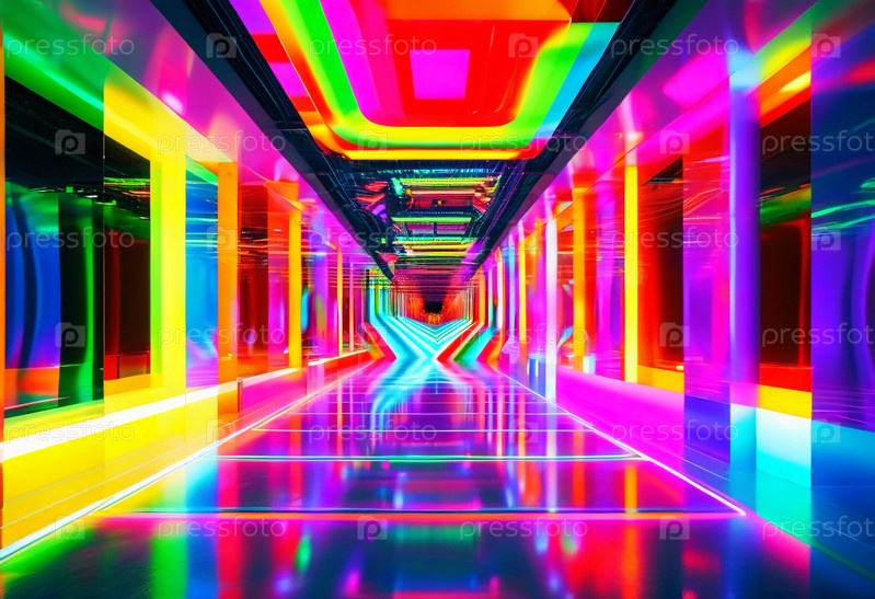 Впечатляющий коридор, освещенный яркими психоделическими цветами, улучшает атмосферу ночью, создавая увлекательный визуальный гипнотический опыт для посетителей