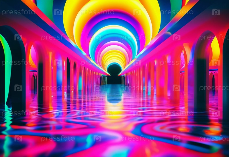 Сюрреалистическая среда, наполненная светящимися арками, излучающими яркие цвета и узоры, отражающиеся в спокойных водах